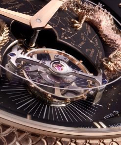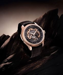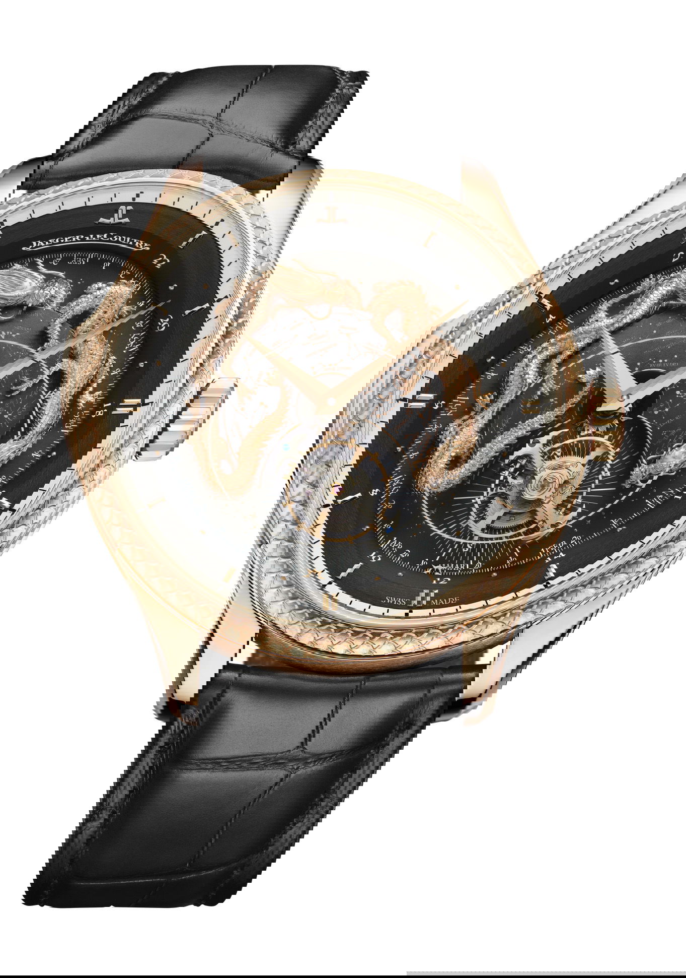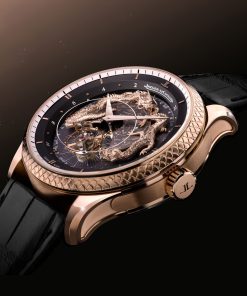 At the heart of this masterpiece is the Calibre 945, a movement first introduced in 2010 that showcases Jaeger-LeCoultre’s unparalleled expertise in celestial complications. It features a Cosmotourbillon, a celestial vault, and a zodiacal calendar, all brought to life on a dial that maps the Northern Hemisphere’s night sky. Surrounding this celestial display are two engraved gold dragons, their detailed forms evoking the immense power of the cosmos as they orbit the dial.