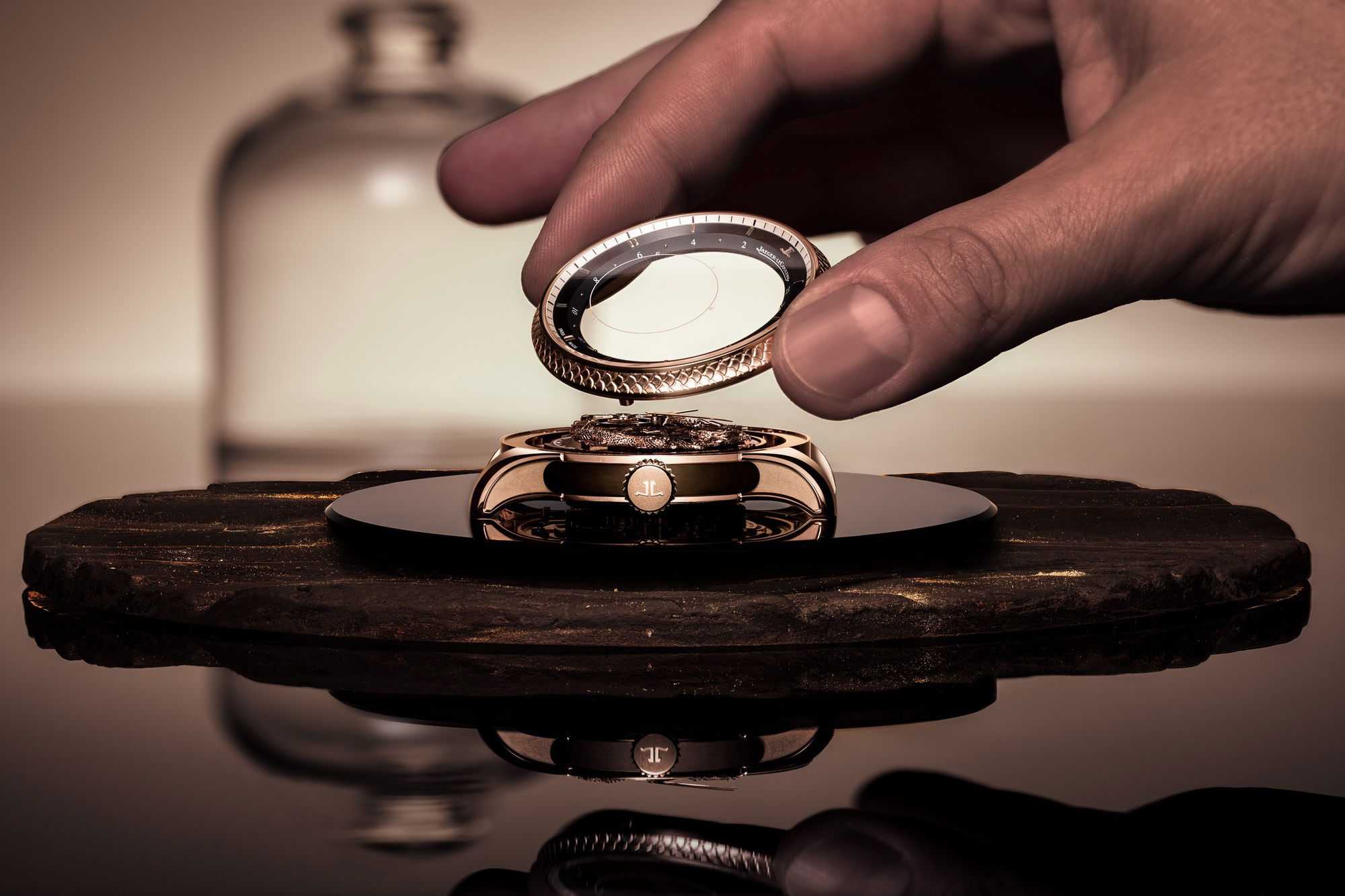 Jaeger-LeCoultre introduces the Master Hybris Artistica Calibre 945 ‘Dragon,’ a timepiece that brings together exceptional craftsmanship and advanced watchmaking know how. Housed in an 18K pink gold case, this limited edition of just five pieces draws inspiration from the mythical power of the dragon.