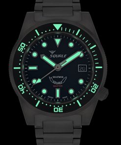The case and bracelet are made entirely of grade 5 titanium, offering strength, corrosion resistance, and exceptional lightness. A 4mm-thick sapphire crystal and a helium escape valve ensure it performs flawlessly under extreme conditions. The brushed ceramic bezel is filled with SuperLuminova Old Radium, echoing the look of early Squale divers while providing high legibility. The three-layer sandwich dial is both functional and refined: a full SuperLuminova base glows beneath a perforated dial, topped with brushed applique indexes. The result is a luminous, legible, and uniquely detailed display, rooted in tradition but designed for the present.