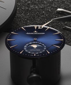 Jaeger-LeCoultre has introduced a new version of the Master Ultra Thin Moon watch in 2023, featuring a pink gold case and a gradient midnight blue dial. This watch combines classic elegance with contemporary sophistication. The contrast between the sunray finish and the deep blue gradient dial, along with the warm pink gold case, creates a striking visual impact. The dial features long, tapered triangle hour markers, applied ‘JL’ logo, Dauphine hands, and golden dots for minutes. The moon-phase display adds refinement with textured finishes, and the date is displayed around the moon-phase aperture.