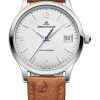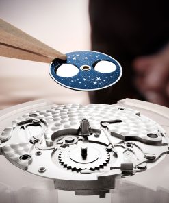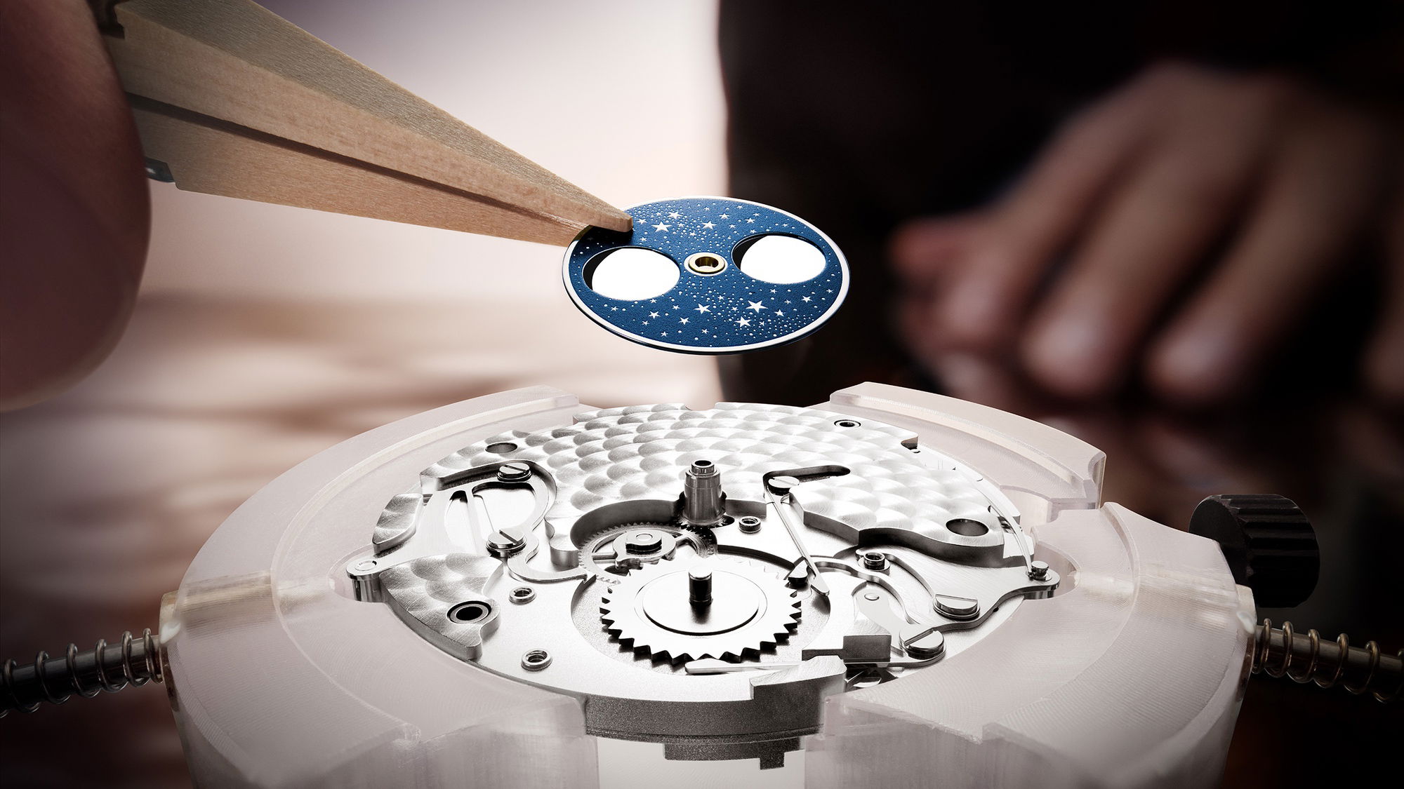 The 39mm case frames a dial celebrated for its balance: elongated indexes, faceted Dauphine hands and, at 6 o’clock, the signature moon-phase display. Here, the complication takes centre stage with a silver moon floating over a deep blue, star-studded sky, encircled by a date track printed directly on the copper surface. The harmonious proportions reinforce the Master Ultra Thin’s discreet sophistication, while the new brown alligator strap adds warmth and an extra layer of versatility.