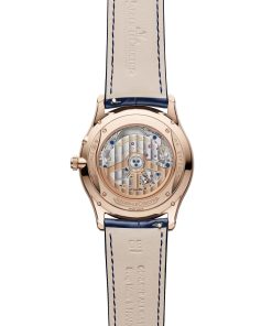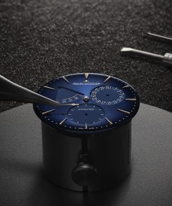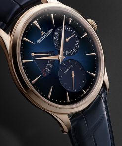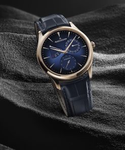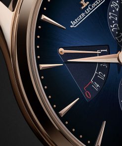 The power reserve function, a distinctive feature pioneered by Jaeger-LeCoultre in 1948, is skillfully showcased along with the date and small seconds indicators, testifying to the complexity of the calibre and the craftsmanship of Jaeger-LeCoultre’s watchmakers. In terms of design, while the watch retains its classic 39mm diameter and 8.95mm thickness, it features a subtly modernized case with revised proportions and slimmer lugs for better wrist comfort. The dial has also been refined for greater legibility and aesthetic appeal. It features a gradient midnight blue sunray pattern, larger sub-dials, elongated hour markers, and Dauphine hands with distinct polished and satin finishes. These elements, along with the golden dots marking the minutes track, create a striking contrast with the sunray dial and match the color of the pink gold case, ensuring aesthetic harmony.