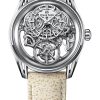 The Spring Drive 8 Days Jewelry Watch’s platinum case is polished and set with diamonds and sapphires on angular lugs, and hand-engraved surfaces. The dial resembles a lion’s mane, surrounded by gemstone hour markers. Powered by the Spring Drive 8 Days Caliber 9R01, the watch offers high accuracy and an eight-day power reserve. The movement’s design symbolizes Mt. Fuji and Lake Suwa.
