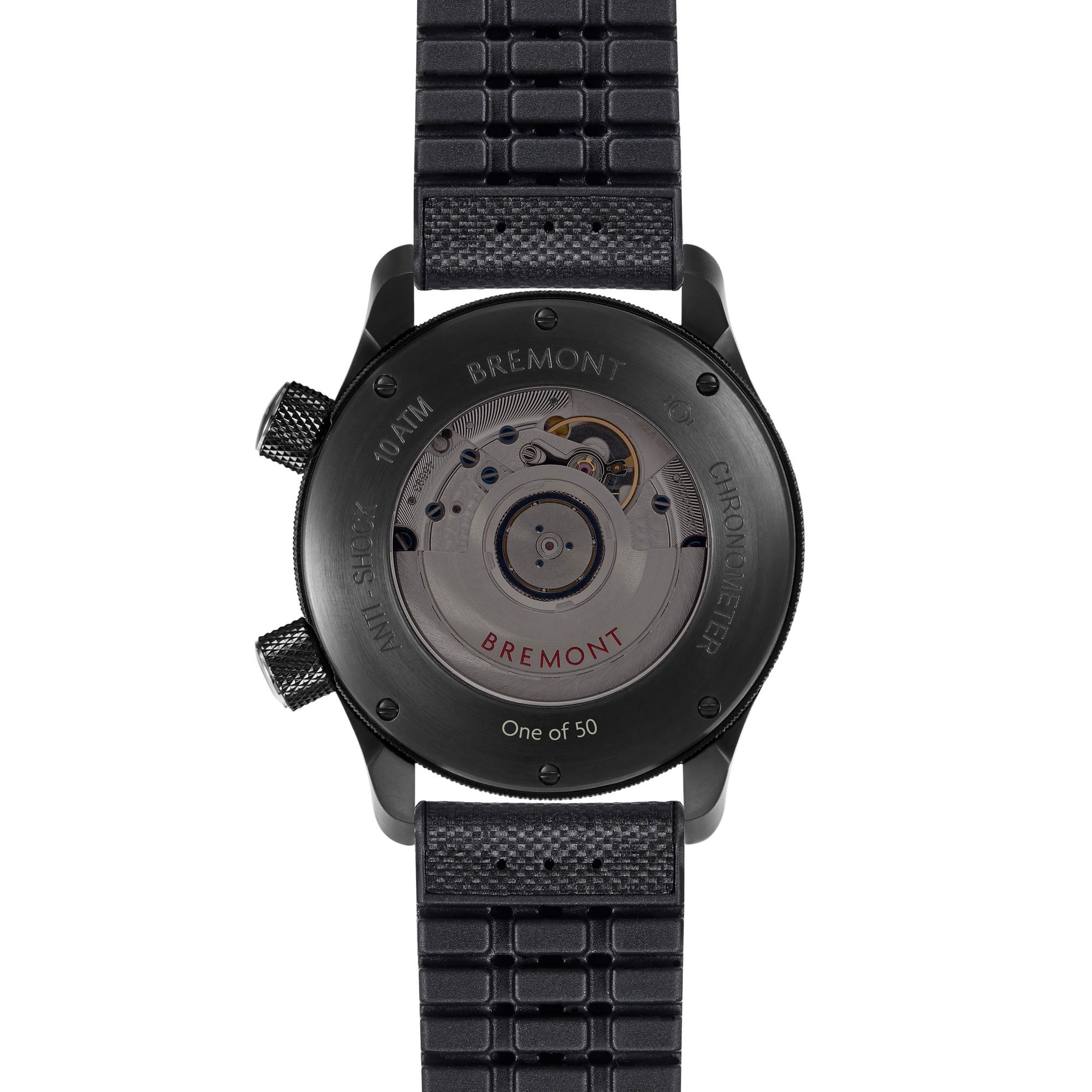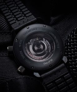 Visually, the watch presents a striking all-black design with hands and numerals coated in Super-LumiNova®, ensuring visibility in low-light conditions. The exhibition smoked crystal case-back showcases the mechanical movement and the rubberized anti-shock movement mount.