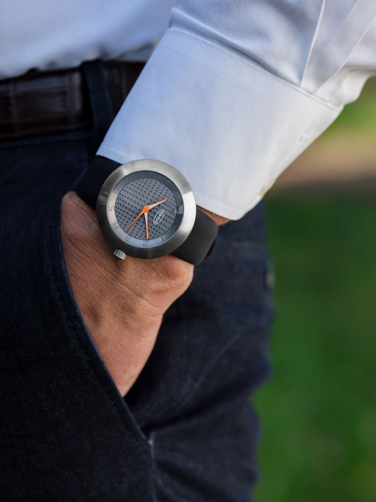 The strap is made of rubber with a pin buckle, in contrast to the original minimalist Ikepod strap, which is now standard on the Apple Watch designed by Marc Newson. The Megapod’s dial design was created by Alexandre Peraldi, the former design chief of Baume & Mercier.