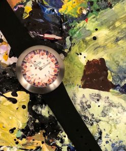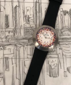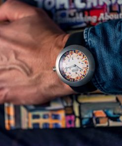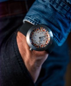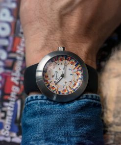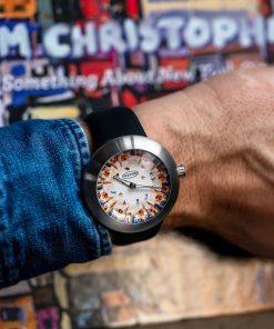 The dial is a canvas for Tom Christopher’s distinctive artistic style, characterized by his chaotic and vivid impressions of New York City. On this watch, he presents a captivating and colorful rendition of the New York City skyline that encircles the dial. The skyscrapers appear to converge towards the center of the dial, where a group of skaters is skillfully integrated into the bustling scene. Christopher’s patchwork approach to depicting the cityscape involves a multitude of color blocks, forming an intricate tapestry of shapes and colors that may not be immediately recognizable from a distance. However, the name of the watch, ‘Skaters In The Sky,’ offers a clear and relatable context for the artwork, taking it from the abstract to a portrayal of a distinct subject matter, capturing the essence of urban life and movement in the heart of the city that never sleeps. This fusion of art and horology encapsulates Ikepod’s ongoing commitment to creativity and innovation in the world of watchmaking, making ‘Skaters In The Sky’ a compelling addition to their legacy of art-inspired timepieces.