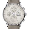 Limited to 150 pieces, this watch is a modern interpretation of a rare gold model from the past, inspired by a personal acquisition of the managing director, Hannes Steim. The telemeter scale, printed in red against a grey background, allows the wearer to measure the distance from events emitting light and sound, such as thunderstorms. The tachymeter scale, encircling the dial’s outer perimeter, measures average speeds.