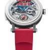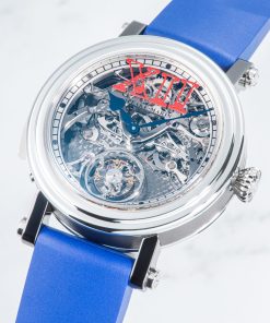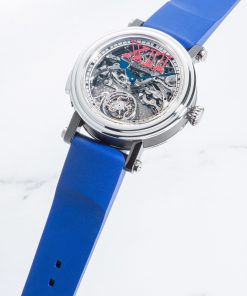 The ‘Minute Repeater Carillon’ boasts a unique ‘Piccadilly’ case made from a combination of platinum, Grade 5 titanium, and sapphire, offering a distinctive look and enhancing the chime’s sound. Its design features a 60-second flying tourbillon at 6 o’clock and a visible Minute Repeater Carillon mechanism at 12 o’clock, which animates the 12-hour markers during chiming without affecting timekeeping.