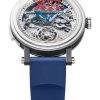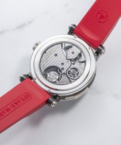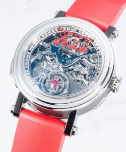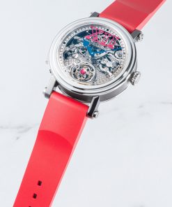 The ‘Minute Repeater Carillon’ boasts a unique ‘Piccadilly’ case made from a combination of platinum, Grade 5 titanium, and sapphire, offering a distinctive look and enhancing the chime’s sound. Its design features a 60-second flying tourbillon at 6 o’clock and a visible Minute Repeater Carillon mechanism at 12 o’clock, which animates the 12-hour markers during chiming without affecting timekeeping.