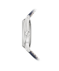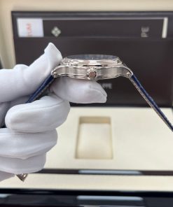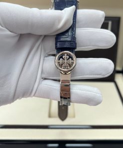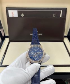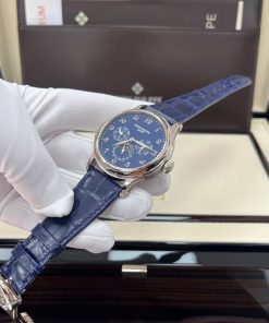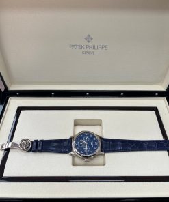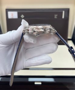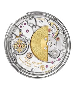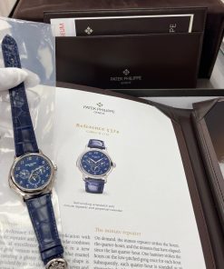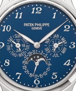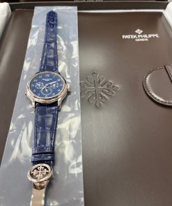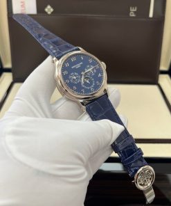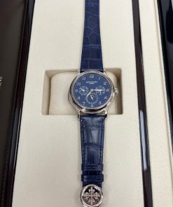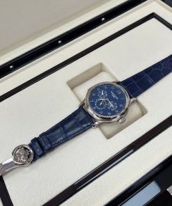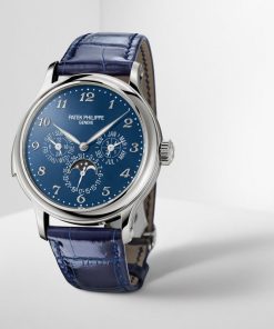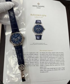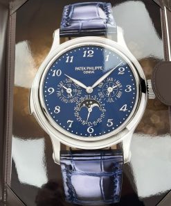 The Reference 5374 Grand Complication with minute repeater and perpetual calendar combines technical excellence and elegance in a new white gold version with a Grand Feu blue enamel dial featuring a glossy finish. The case shape is distinguished by its subtle interplay of curves and its concave bezel. The minute repeater with its “cathedral” gongs wrapping almost twice around the movement is distinguished by its rich, deep sound.