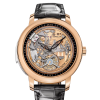 This self-winding rose gold Grand Complication model is distinguished by its baguette-cut diamond setting – a sparkling touch that highlights the impressive show staged by the movement with its ingenious calendar display system featuring sapphire disks. The “leaf” pattern engraved on the white gold inlays adorning the case flanks is echoed on the off-centered rose gold mini-rotor.