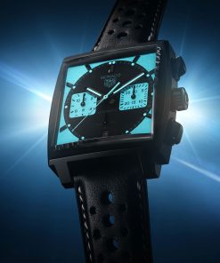 The Monaco Night Driver captures the magic of driving in the dark. Its dial transforms from cool grey to vivid blue, ensuring readability even in low light. This watch pays homage to legendary Monaco chronographs with its deep blue glow. Designed for racers, it combines style and performance in one iconic timepiece.