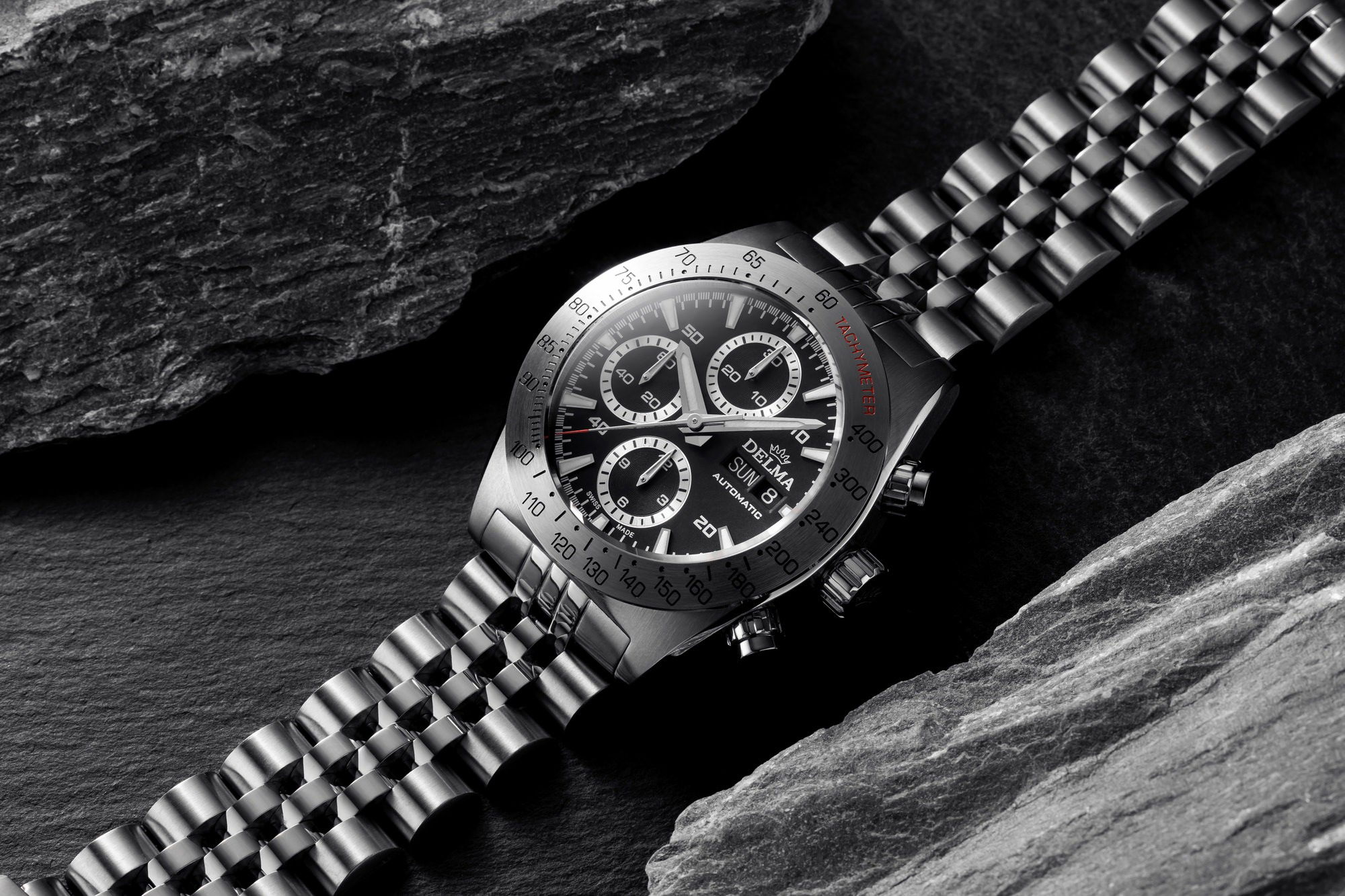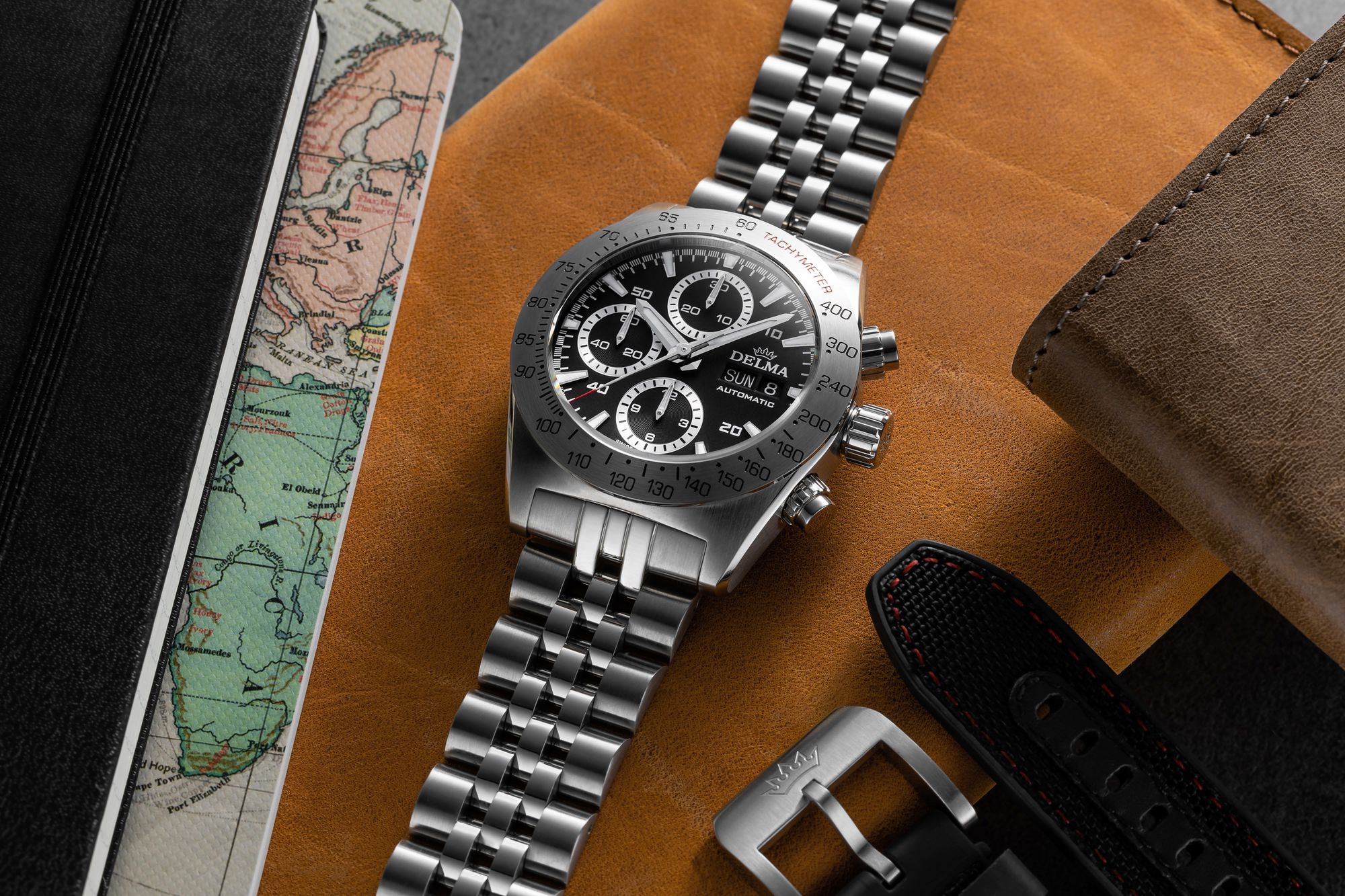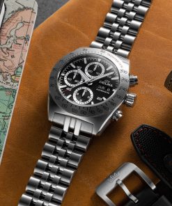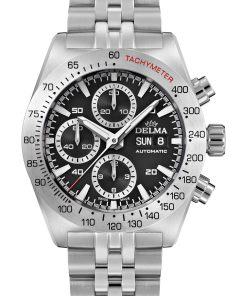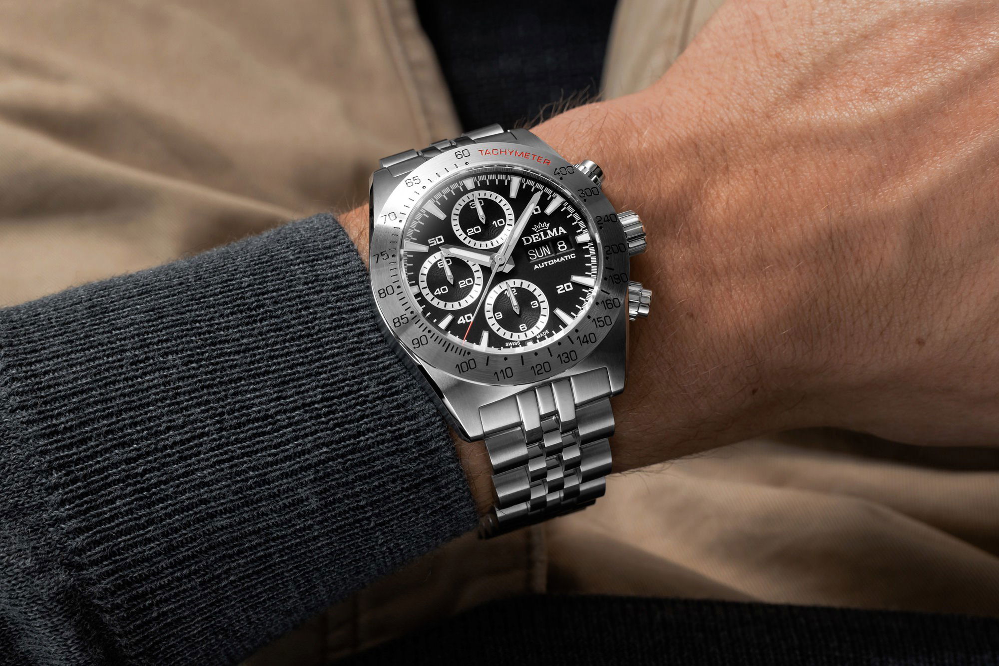 Motorsport influences run through the design, from the sunray brushed dial to the intricately patterned guilloche sub-dials. Bold hour and minute hands, paired with a vivid red seconds hand, glide over the dial with clarity and purpose. A neatly integrated day-date window sits beneath the DELMA emblem, adding a subtle touch of sophistication. Whether you’re on the track, off-road, or simply navigating daily life, the Montego delivers both function and flair.