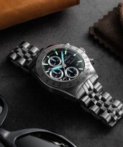 As daylight fades, the Montego reveals its luminous secret: glowing hands and vibrant green indices ensure excellent legibility in the dark—and lend the watch a striking nighttime charisma. A screw-down crown adds to its robust build, while the black cordura rubber strap offers both comfort and strength. In every detail, the Montego chronograph reflects a passion for precision and an unshakable sense of style.