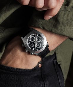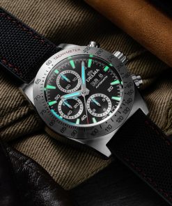 As daylight fades, the Montego reveals its luminous secret: glowing hands and vibrant green indices ensure excellent legibility in the dark—and lend the watch a striking nighttime charisma. A screw-down crown adds to its robust build, while the black cordura rubber strap offers both comfort and strength. In every detail, the Montego chronograph reflects a passion for precision and an unshakable sense of style.