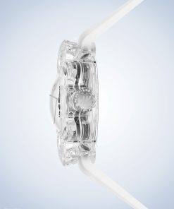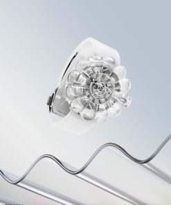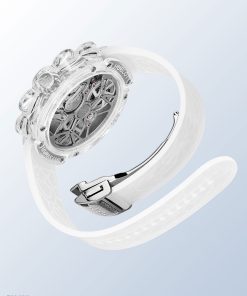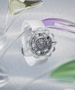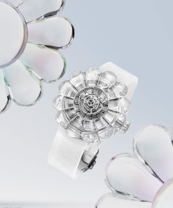 Surrounding the tourbillon is Murakami’s signature flower motif, crafted entirely from sapphire. The design emphasizes transparency to enhance luminosity, incorporating a sapphire case, case-back, crown, and a translucent flange and strap. This transparency allows light to pass through, highlighting the watch’s intricate details.