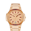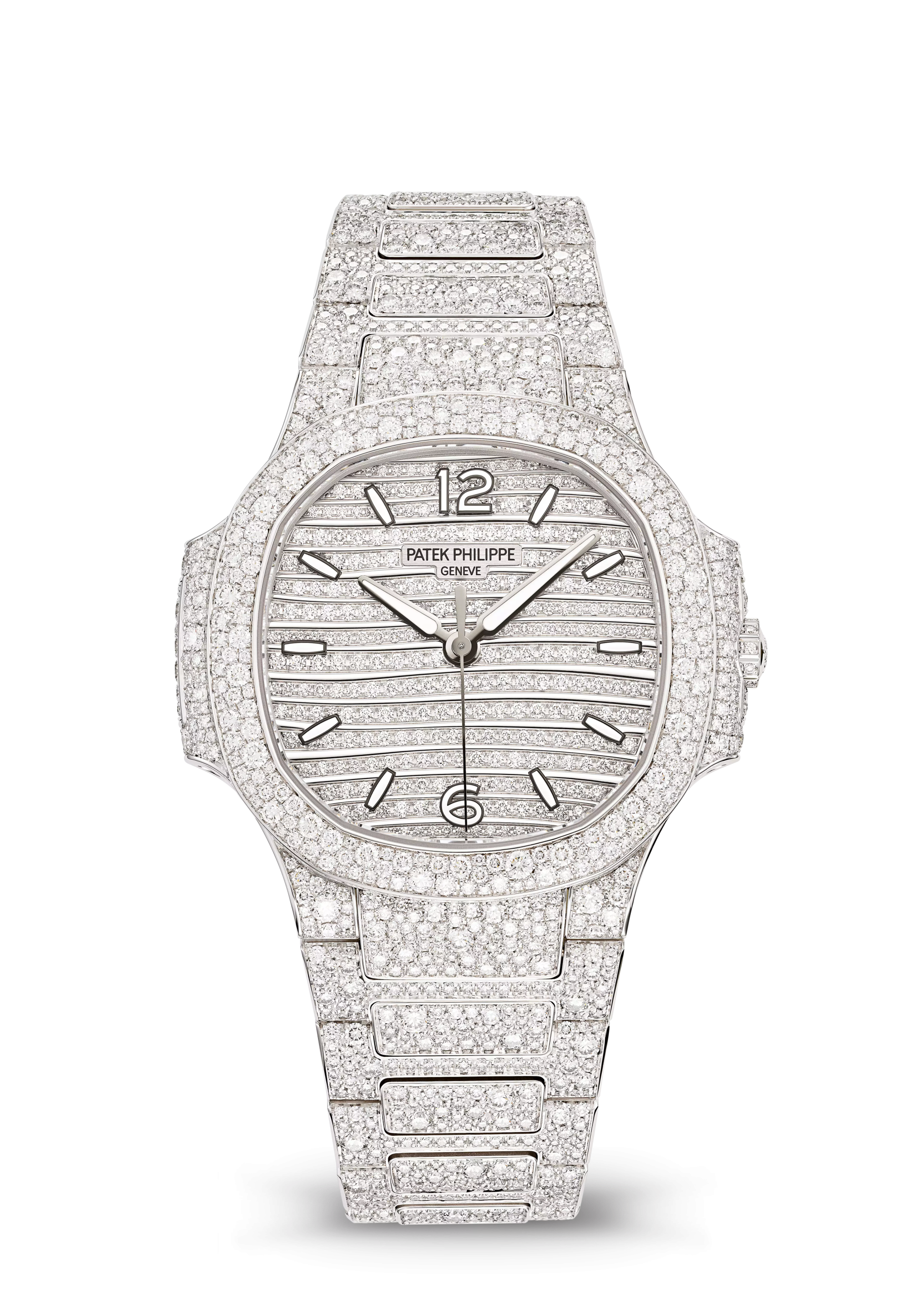 Patek Philippe combines the iconic Nautilus design with the refined touch of Haute Joaillerie in a white gold model on which the case, bezel and bracelet are adorned with snow-set diamonds. The dial is lit up by rows of gems following the dainty wave pattern typical of the Ladies’ Nautilus collection. Beating at the heart of this horological treasure is a mechanical self-winding movement.