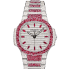 The ladies’ Nautilus is available in a white gold Haute Joaillerie version set with brilliant-cut diamonds and blue sapphires enhancing its iconic design. The case, bezel and bracelet feature the virtuoso ‘snow setting’ technique, while a transparent sapphire case-back reveals the self-winding movement.