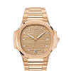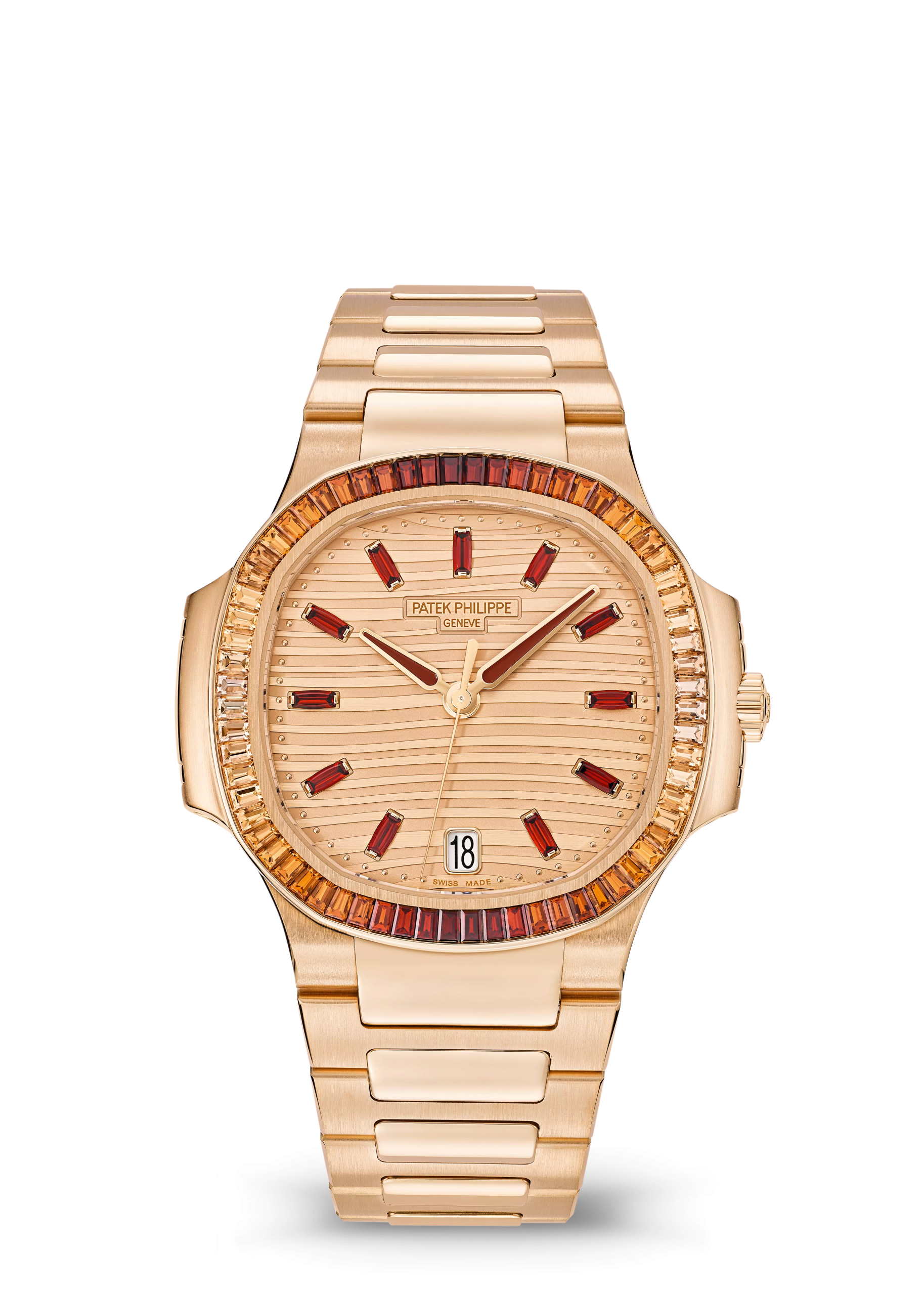 Patek Philippe has reinterpreted the cult design of the ladies’ automatic Nautilus in a gemset version, where rose gold combines with the sparkle of spessartites in a blend of elegance and originality. The octagonal bezel is adorned with a double gradient of baguette-cut gems ranging from “cognac” to “champagne” tones. The dial features a wave pattern and spessartite hour-markers ensuring perfect legibility.