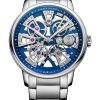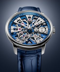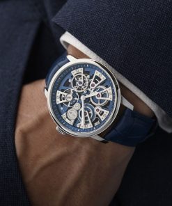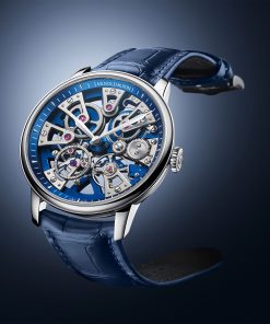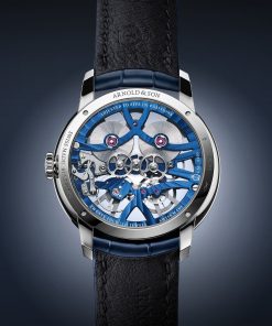 The Nebula 40 Steel Blue Edition by Arnold & Son is a skeleton watch that immediately draws the eye with its star-shaped structure and rich blue tones. The seven bridges radiate outwards in perfect symmetry, giving the watch its name and distinct character. This design isn’t just for show, it supports the entire movement, creating a sense of depth and order that feels both technical and artistic. Building on earlier versions in black and gold, this blue edition adds a fresh, modern edge while keeping the elegance that defines the Nebula line.