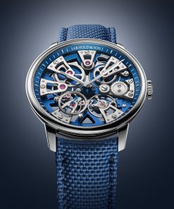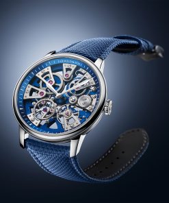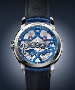 The Nebula 40 Steel Blue Edition by Arnold & Son is a skeleton watch that immediately draws the eye with its star-shaped structure and rich blue tones. The seven bridges radiate outwards in perfect symmetry, giving the watch its name and distinct character. This design isn’t just for show, it supports the entire movement, creating a sense of depth and order that feels both technical and artistic. Building on earlier versions in black and gold, this blue edition adds a fresh, modern edge while keeping the elegance that defines the Nebula line.