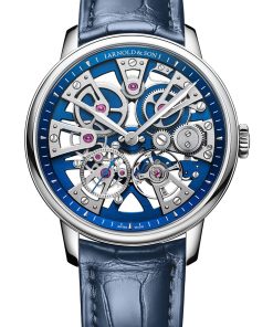 The Nebula 40 Steel Blue Edition by Arnold & Son is a skeleton watch that immediately draws the eye with its star-shaped structure and rich blue tones. The seven bridges radiate outwards in perfect symmetry, giving the watch its name and distinct character. This design isn’t just for show, it supports the entire movement, creating a sense of depth and order that feels both technical and artistic. Building on earlier versions in black and gold, this blue edition adds a fresh, modern edge while keeping the elegance that defines the Nebula line.