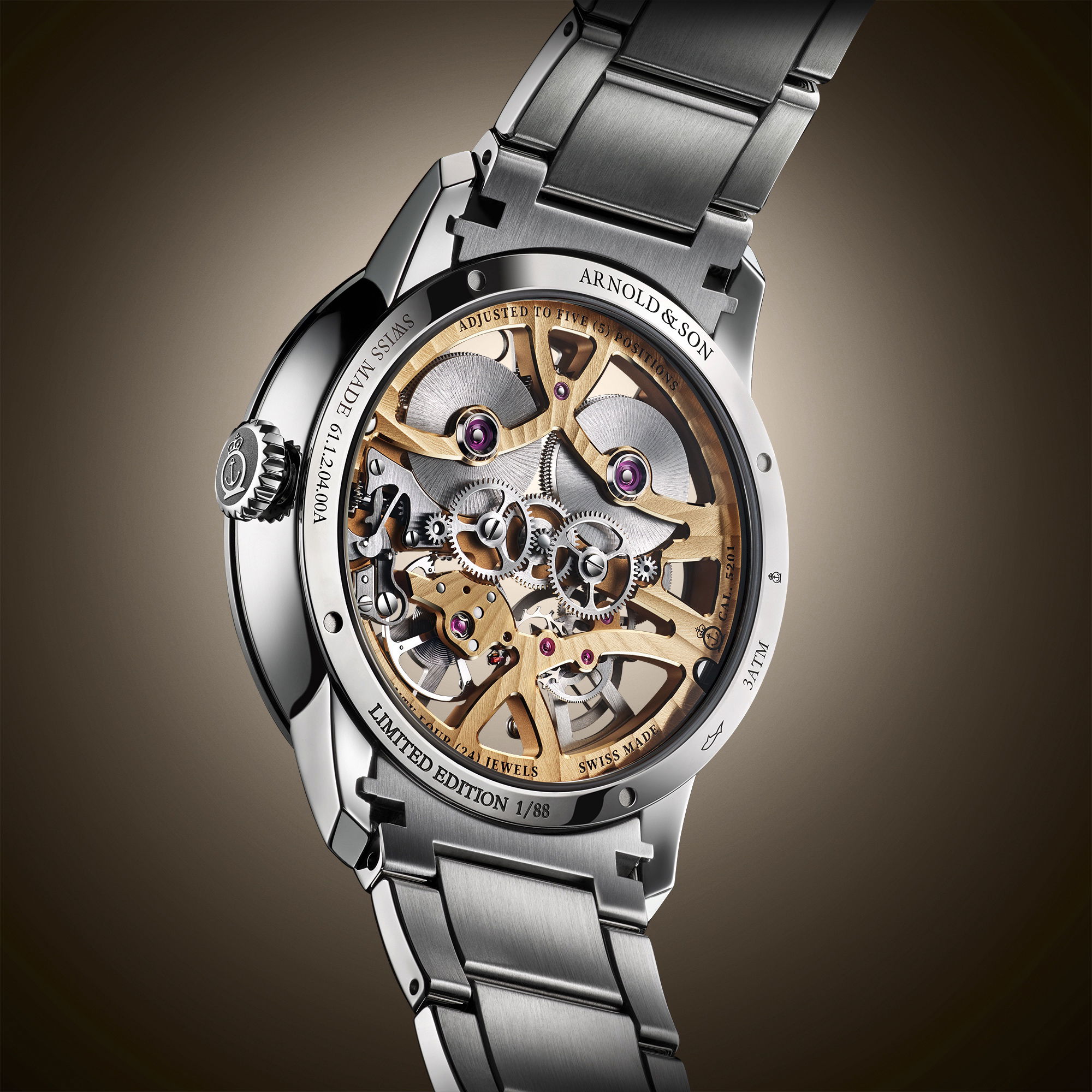 Two versions of the Nebula 40 Steel are introduced: one featuring a black rhodium-plated movement paired with versatile straps, and the other, a limited edition of 88 timepieces with gold-accented components. Both feature intricate finishing techniques like palladium-finished bridges and Arnold & Son’s signature “Rayons de la Gloire” motif.