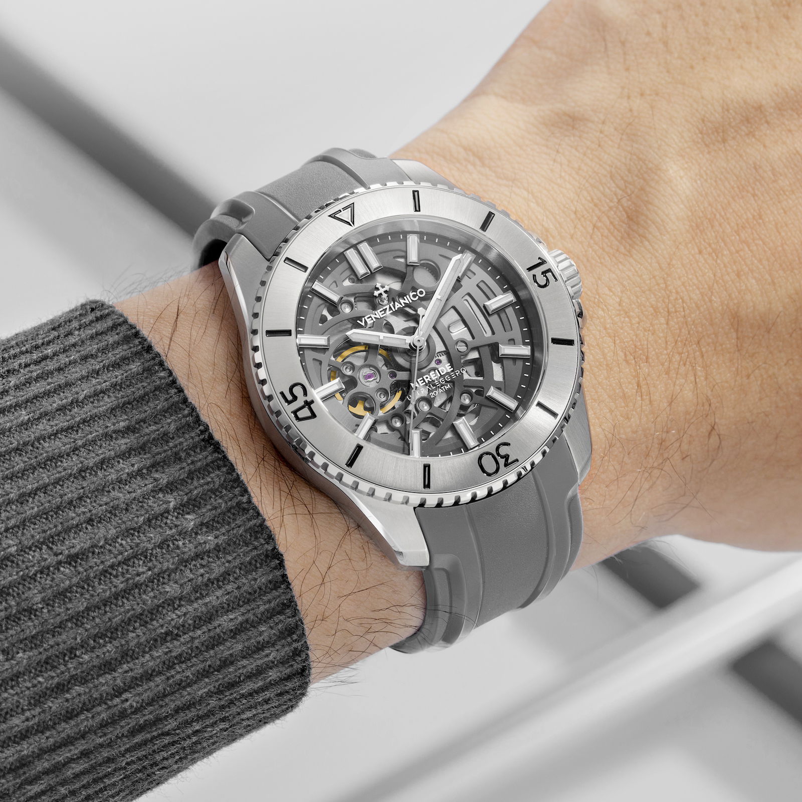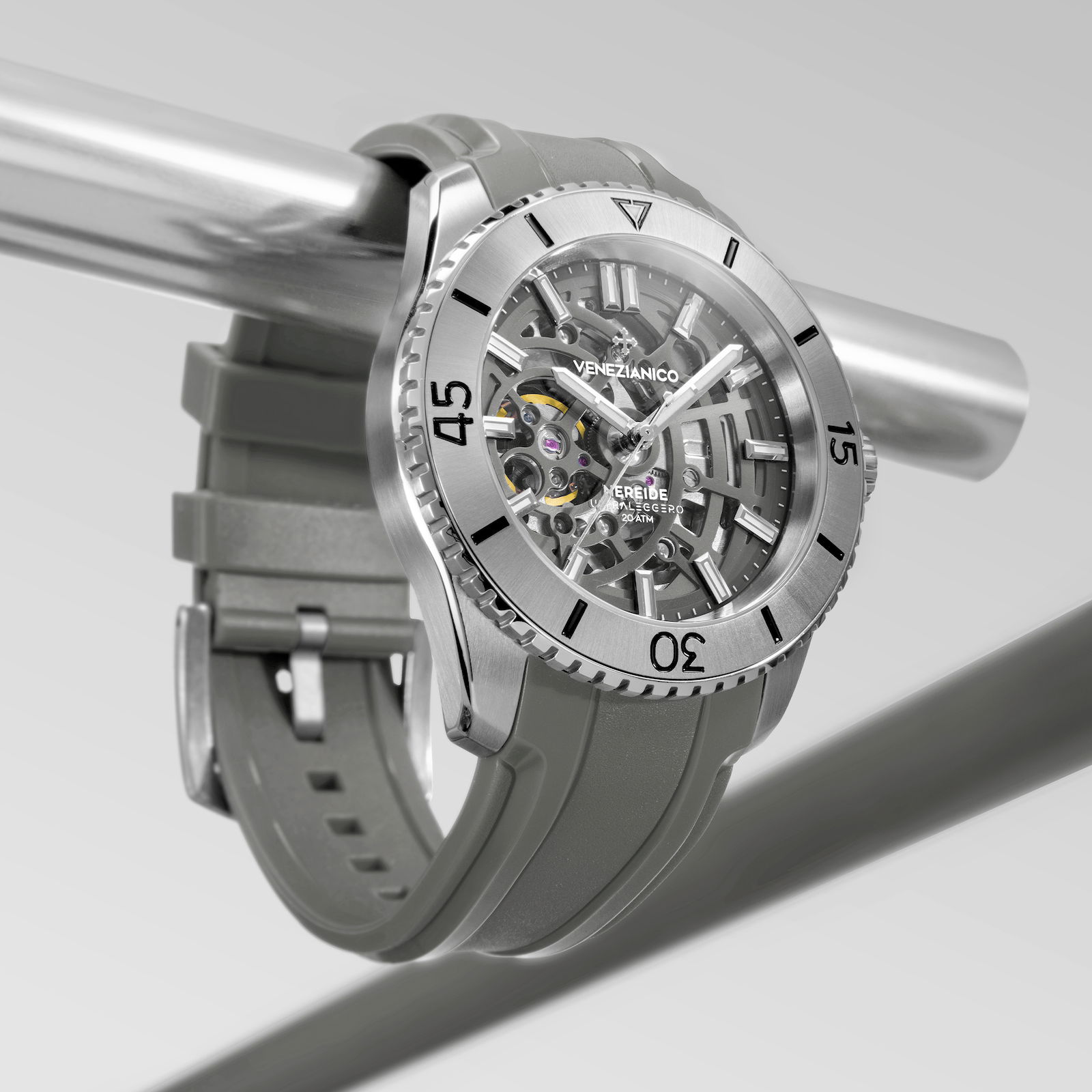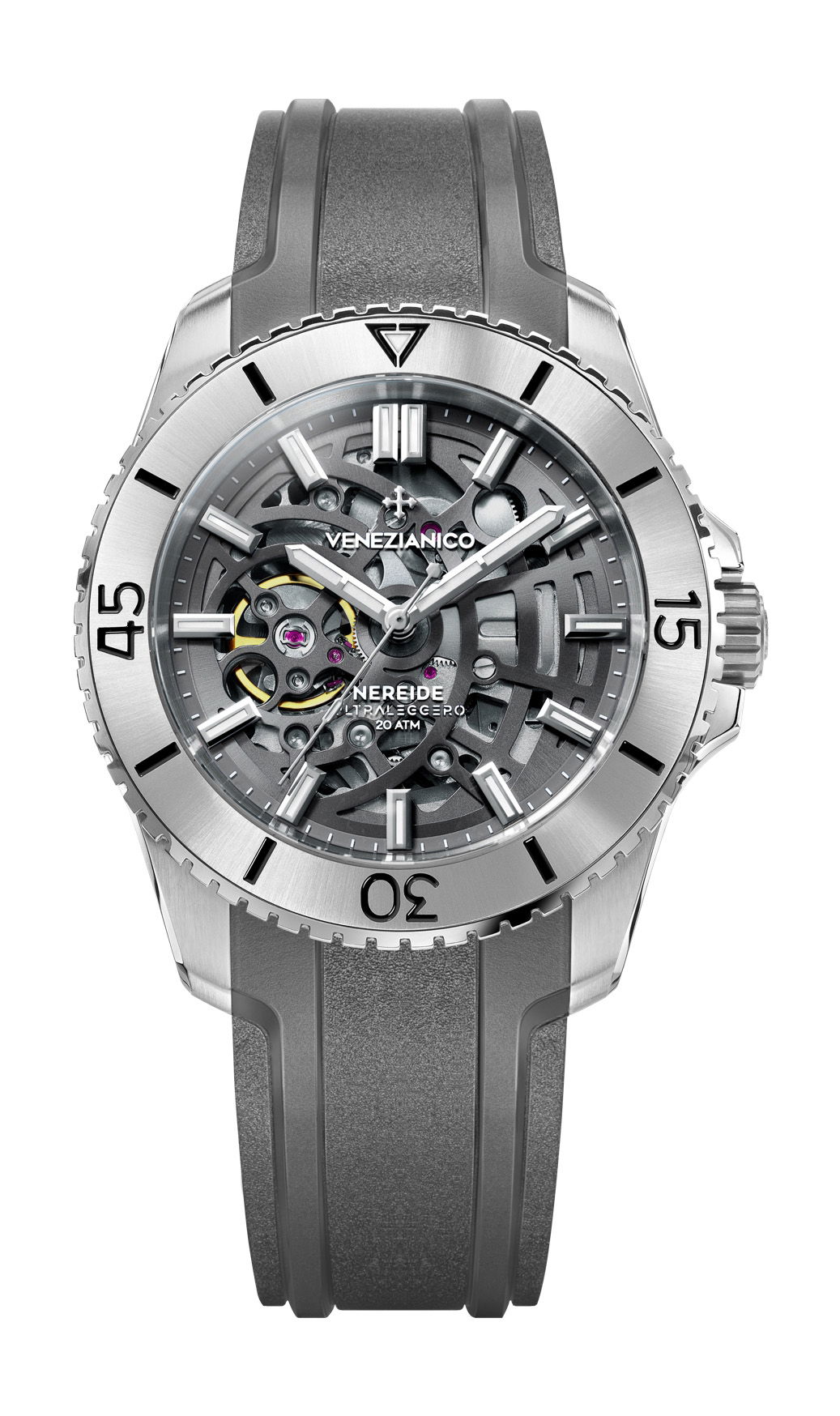 The Nereide Ultraleggero watch is a sophisticated and innovative timepiece, characterized by a meticulously balanced dial following Leonardo da Vinci’s golden ratio. This design ensures a visually harmonious and structured aesthetic. The watch has a strong identity with a sporty essence, featuring a refined design complemented by a rubber strap that seamlessly conforms to the case shape. The strap offers exceptional comfort, elasticity, and resistance to extreme temperature variations ranging from -30°C to +70°C.