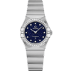 This 25 mm 18K Sedna™ gold and stainless steel model features a bezel with engraved Roman numerals and a blue aventurine glass dial with diamond hour markers. The hands, OMEGA logo, Constellation star and diamond holders are also in 18K Sedna™ gold.