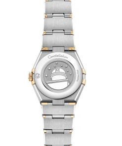 This 25 mm 18K yellow gold and stainless steel model features a bezel engraved with Roman numerals, crystal white silvery dial and scratch-resistant saphire crystal. The hands, OMEGA logo, Constellation star and indexes are also in 18K yellow gold.