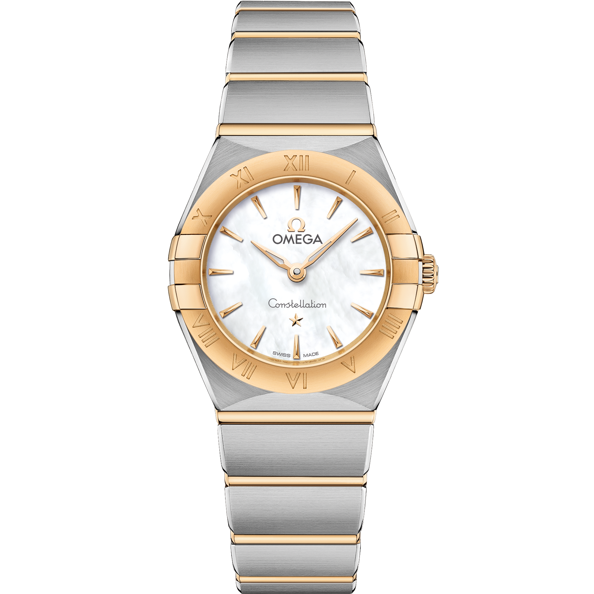 This 25 mm 18K yellow gold and stainless steel model features a bezel engraved with Roman numerals, white mother-of-pearl dial and scratch-resistant saphire crystal. The hands, OMEGA logo, Constellation star and indexes are also in 18K yellow gold.