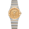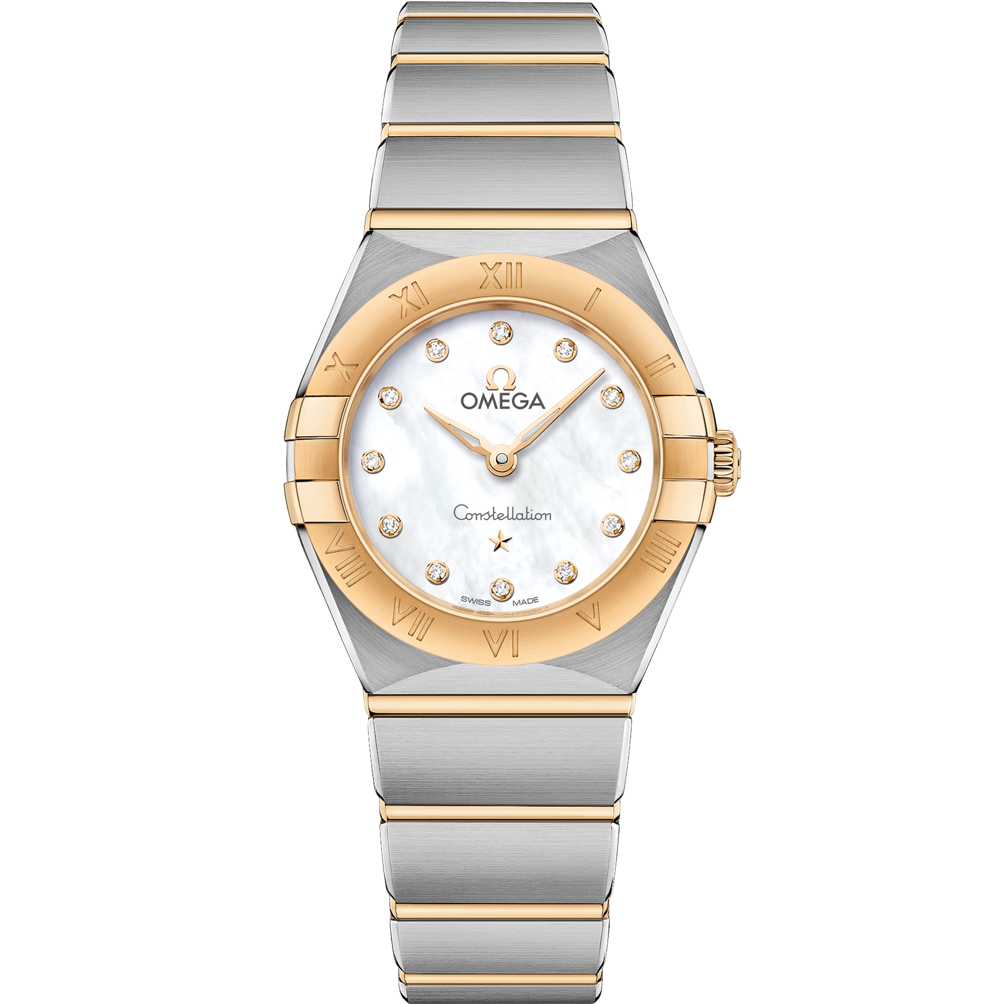 This 25 mm 18K yellow gold and stainless steel model features a bezel engraved with Roman numerals, white mother-of-pearl dial with diamond hour markers and scratch-resistant saphire crystal. The hands, OMEGA logo, Constellation star and diamond holders are also in 18K yellow gold.