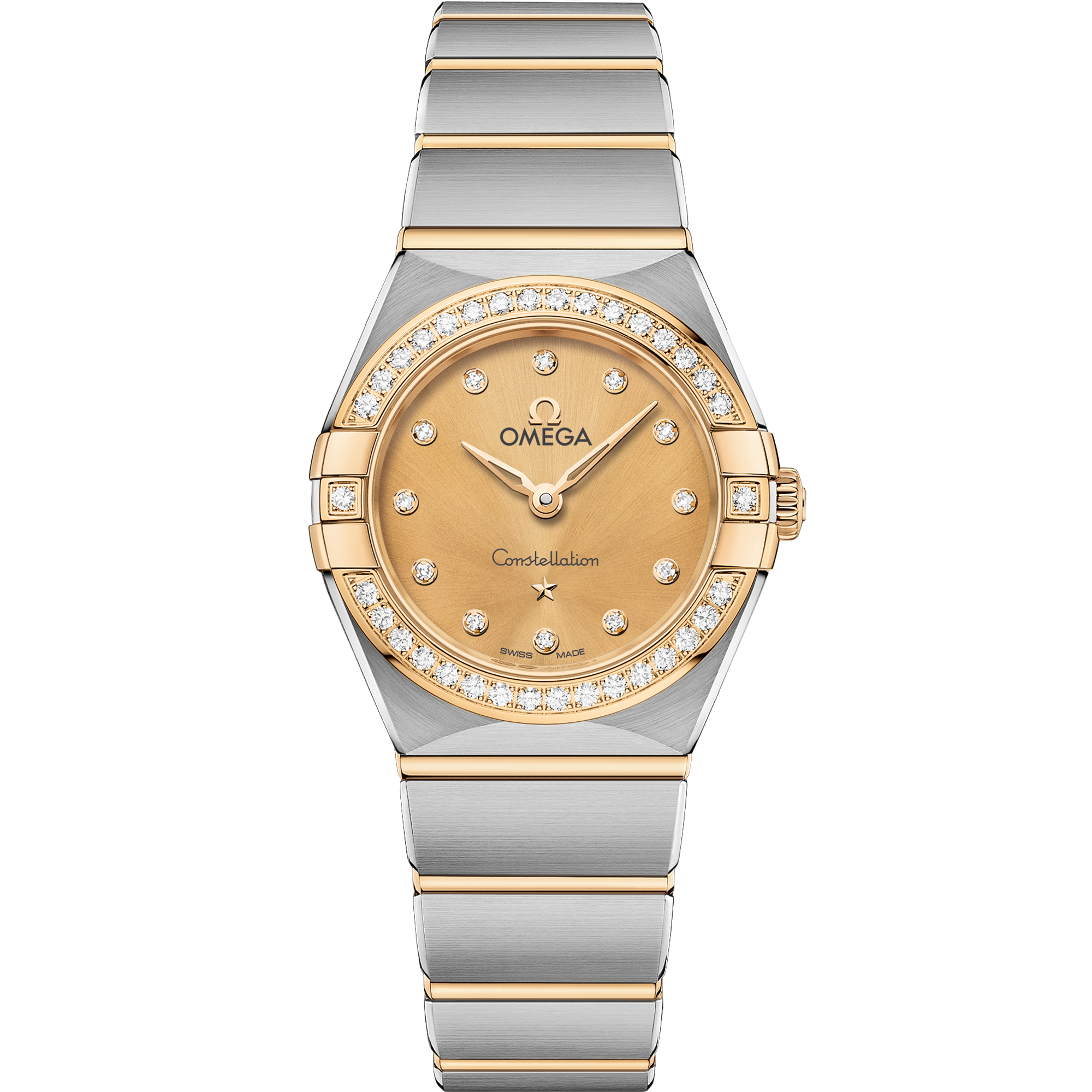 This 25 mm 18K yellow gold and stainless steel model features a diamond-paved bezel, sun-brushed champagne dial with diamond hour markers and scratch-resistant saphire crystal. The hands, OMEGA logo, Constellation star and diamond holders are also in 18K yellow gold.