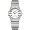 This 28 mm stainless steel model features a bezel engraved with Roman numerals, white mother-of-pearl dial and scratch-resistant sapphire crystal. The hands, OMEGA logo, Constellation star and indexes are in 18K white gold.