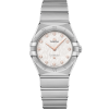 This 28 mm stainless steel model features a bezel engraved with Roman numerals, white mother-of-pearl dial with diamond hour markers and scratch-resistant sapphire crystal. The hands, OMEGA logo, Constellation star and diamond holders are in 18K white gold.