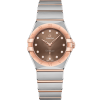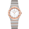 This 28 mm 18K Sedna™ gold and stainless steel model features a bezel engraved with Roman numerals, crystal white silvery dial with diamond hour markers and scratch-resistant sapphire crystal. The hands, OMEGA logo, Constellation star and diamond holders are also in 18K Sedna™ gold.