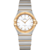 This 28 mm 18K yellow gold and stainless steel model features a bezel engraved with Roman numerals, sun-brushed champagne dial with diamond hour markers and scratch-resistant sapphire crystal. The hands, OMEGA logo, Constellation star and diamond holders are also in 18K yellow gold.