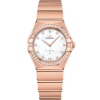 This 28 mm 18K yellow gold and stainless steel model features a diamond-paved bezel, white mother-of-pearl dial with diamond hour markers and scratch-resistant sapphire crystal. The hands, OMEGA logo, Constellation star and diamond holders are also in 18K yellow gold.