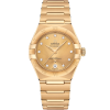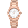 This 29 mm 18K Sedna™ gold model features a diamond-paved bezel, pearled mother-of-pearl dial with diamond hour markers and a date window at the 6 o’clock position. The bracelet, hands, OMEGA logo, Constellation star and diamond holders are also in 18K Sedna™ gold.