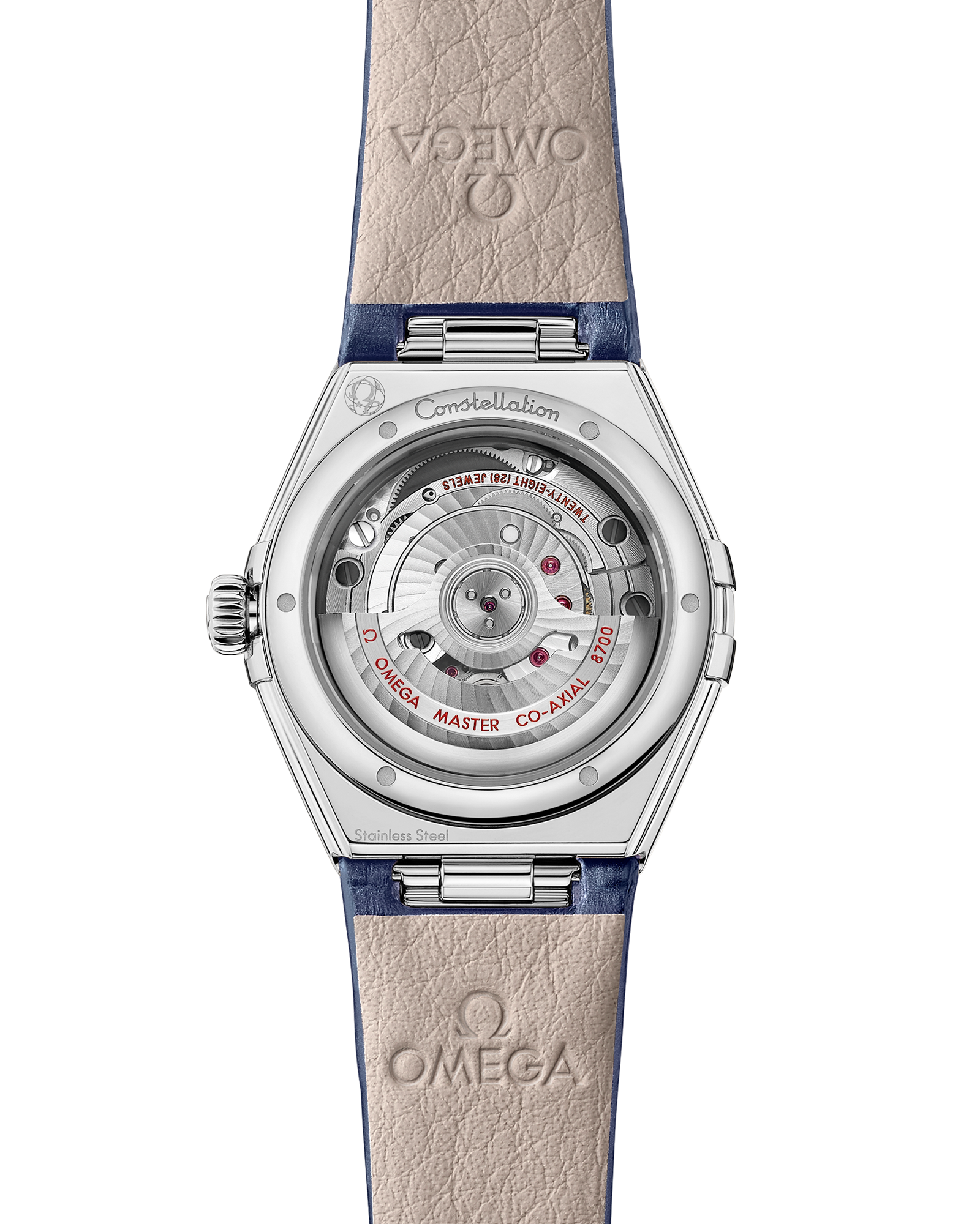 The watch is presented on a shimmering blue leather strap, and is powered by the OMEGA Co-Axial Master Chronometer Calibre 8700, which is visible through the sapphire crystal caseback.