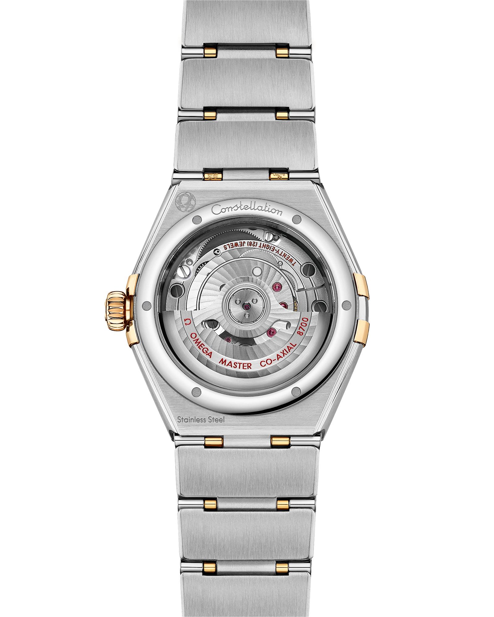At the heart of this timepiece is the OMEGA Co-Axial Master Chronometer Calibre 8700, visible through the domed scratch-resistant sapphire crystal.