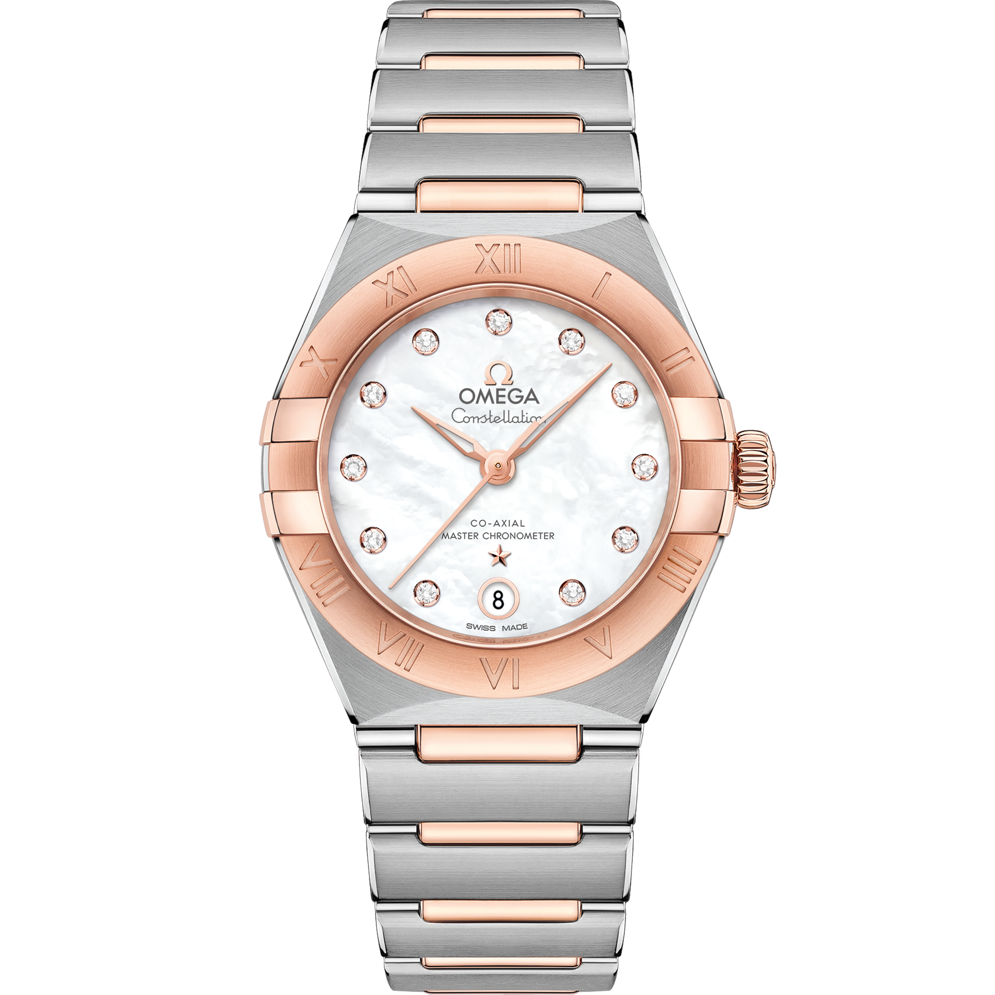 This 29 mm 18K Sedna™ gold and stainless steel model features a bezel engraved with Roman numerals, pearled mother-of-pearl dial with diamond hour markers and a date window at the 6 o’clock position. The hands, OMEGA logo, Constellation star and diamond holders are also in 18K Sedna™ gold.