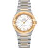 This 29 mm 18K yellow gold and stainless steel model features a bezel engraved with Roman numerals, crystal white slivery dial and a date window at the 6 o’clock position. The hands, OMEGA logo, Constellation star and indexes are also in 18K yellow gold.