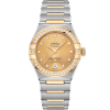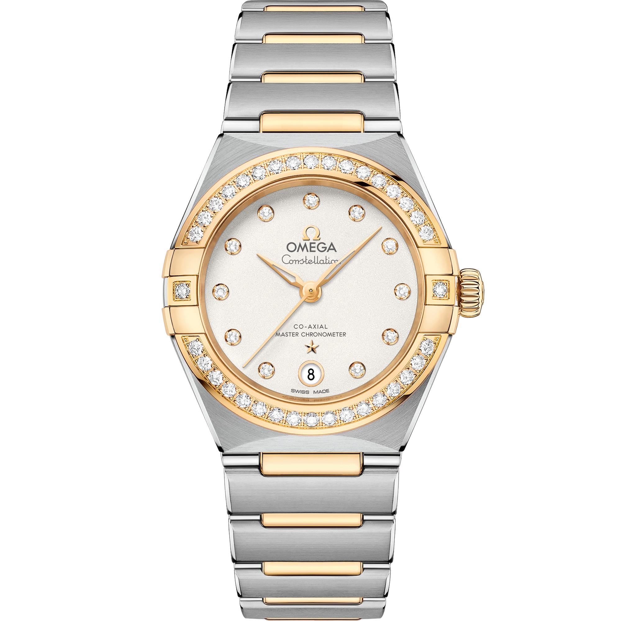 This 29 mm 18K yellow gold and stainless steel model features a diamond-paved bezel, crystal white slivery dial with diamond hour markers and a date window at the 6 o’clock position. The hands, OMEGA logo, Constellation star and diamond holders are also in 18K yellow gold.