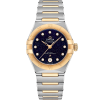 This 29 mm 18K yellow gold and stainless steel model features a diamond-paved bezel, blue aventurine glass dial with diamond hour markers and a date window at the 6 o’clock position. The hands, OMEGA logo, Constellation star and diamond holders are also in 18K yellow gold.