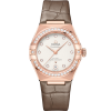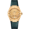 This 29 mm 18K yellow gold model features a diamond-paved bezel, crystal white silvery dial with diamond hour markers and a date window at the 6 o’clock position. The hands, OMEGA logo, Constellation star and diamond holders are also in 18K yellow gold.