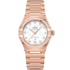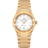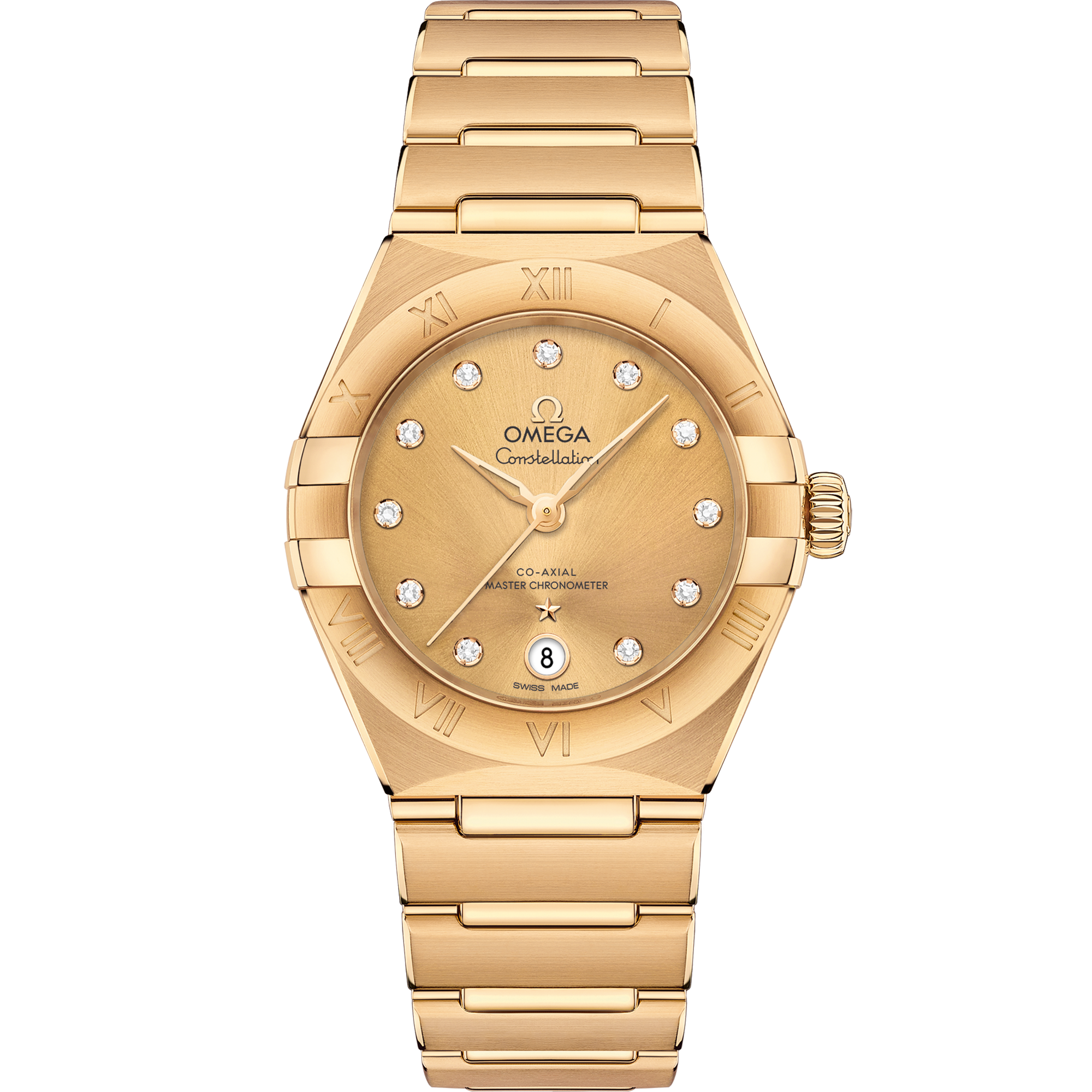 This 29 mm 18K yellow gold model features a bezel engraved with Roman numerals, sun-brushed champagne dial with diamond hour markers and a date window at the 6 o’clock position. The bracelet, hands, OMEGA logo, Constellation star and diamond holders are also in 18K yellow gold.