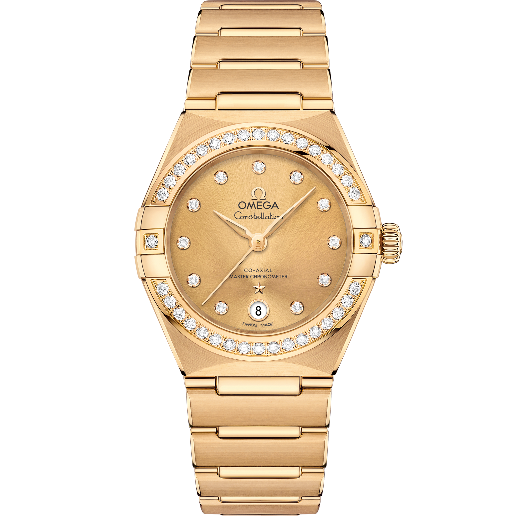 This 29 mm 18K yellow gold model features a diamond-paved bezel, sun-brushed champagne dial with diamond hour markers and a date window at the 6 o’clock position. The bracelet, hands, OMEGA logo, Constellation star and diamond holders are also in 18K yellow gold.