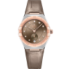 This 34 mm model in stainless steel features a bezel with engraved Roman Numerals, a sun-brushed peacock blue dial, and a round date window at the 6 o’clock position. The incremental diamond hour markers are presented in 18K white gold holders, while the Small Seconds subdial and Central Minute Track are circled by rings. The hands, OMEGA logo and Constellation star are also in 18K white gold.