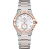 This 34 mm model in 18K Sedna™ gold and stainless steel features a diamond-paved bezel, white pearled mother-of-pearl dial, and a round date window at the 6 o’clock position. The incremental diamond hour markers are presented in 18K Sedna™ gold holders, while the Small Seconds subdial ring is also crafted in 18K Sedna™ gold and set with diamonds.